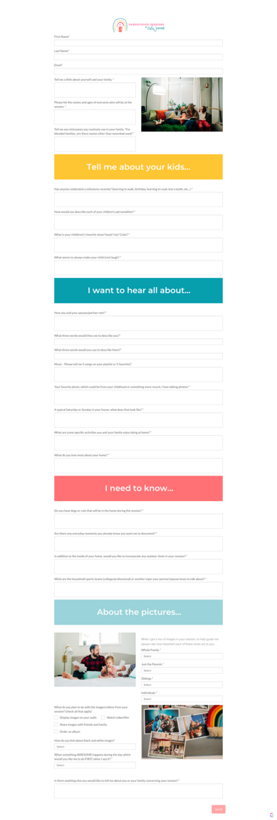Each questionnaire was created for a certain business in mind. Choose from a questionnaire for family photographers, newborn photographers, or general 1:1 service providers.